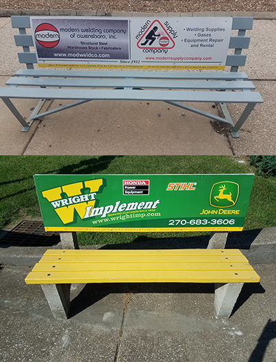 Approximately 120 advertising benches are located at or near city bus stops and street corners throughout the city of Owensboro. This is a great way for passersby to learn more about local businesses and organizations as they drive or walk through town. All you need to do is provide us with a company logo and the wording, and then the Lions Club will do the rest. Rental agreements are for a term of three years.